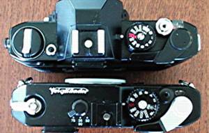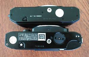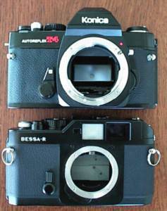 Puleeze... you really thought you would get away with thinking that the Cosina Bessa-R was some kind of radical design. "Incredible innovation." Right. It's not a big secret that the Bessa-R is derived from the standard Cosina SLR: Olympus OM-10, Nikon FM-10, etc. The interesting thing is that the Bessa probably did not even originate as a Cosina design. I had a bunch of cameras out on the dining room table the other day (what else is new) and noticed that the 2000 Bessa-R looked a lot like the (da da da) 1979 Konica Autoreflex T4. Actually, it could just as well be the 1976 Autoreflex TC, from which the T4 was developed. Here are some points of comparison: Overall size: although they don't look like they're the same size in the picture (thanks, o lousy digital camera), they are actually within a couple of millimeters in overall size. Bottom plate: notice where the battery chamber sits. This is an arbitrary feature of camera design, and the Cosina battery cover could have been anywhere they wanted it. The rewind buttons are in the same place, too. Probably not relevant to development, since you can't really change the button location relative to the takeup spool. But... Film chamber: aha! The sprocket wheel and takeup spool is exactly the same. The rewind prongs are exactly the same design, except the T4 is die-cast where the R is stamped. Film rails share a certain je ne sais quoi, but are not identical. Pressure plate is almost identical. Film reminder window on the Bessa is something they didn't use in 1979; ribs are to stiffen the Bessa's plastic back (Konica had a metal back). Top deck: notice that the shutter speed dials are almost identical in construction. They do turn in opposite directions. The frame counter and exposure release are identically situated (note that the reset tab is in a similar location too in the light seal channel. Wind lever... interesting. The Konica has a ratcheted, articulated lever that kicks out to activate the meter. It is held on by a cap screw. The Bessa has no such ratcheting or switch. Its lever, which shares the same contour, has no cap screw — but has the contour of a cap screw molded into it. That's a really odd thing to have if you are designing from scratch. Front: not much exciting here; self timers only go in one place. Strap lugs are identically positioned. |