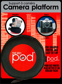 I am writing this a very short distance from Canada. But I can say that every time I am there, I notice something different and unusual. Like the Pods (www.thepod.ca), which are three beanbag-style camera supports. The first thing I thought was, "wow, these are cool." The next thought was, "wow, they are really expensive." The last was, "what the hell, I am already buying a ton of photo supplies." This whole thought process took about 5 seconds and I bought a Red Pod and brought it back to my laboratory for analysis. Ok, so it's not really a lab. And ok, it's not really that technical an analysis. Construction. Basically, each of these is a vinyl and nylon beanbag filled with rice-shaped plastic pellets. The underside is fastened with Velcro, and you could empty out the contents and conceivably fill it with any granular object you could want. The plastic pellets are fairly light and fairly solid when compressed, but I imagine you could also fill the beanbag with lead shot, BBs, or gravel that you collect on the way. My personal vote would be to fill it with Double Bubble gum (before it is chewed). Each Pod has a 1/4" tripod screw on the top. The Red Pod is a large model with tripod screw centered. The Yellow pod is for small cameras with centered sockets. The Blue pod is a small one with an off-center screw (for cameras with the tripod socket all the way off to one side. The Blue pod has a velcro spot on the side opposite the tripod screw. This allows you to velcro the other end of your camera to the Blue Pod. Operation. People have used beanbags for a long time to stead cameras, but the genius lies in putting a tripod screw into the bag so that it never slips out from under the camera. The idea is simple: you spin this onto your camera tripod socket, and when you need extra support, you mash the Pod and camera down on some hard object. The beauty is that the object need not be flat and need not bear any relationship to the shape of your camera. So park bench, support column, whatever. I figured out that if you keep the camera and pod firmly braced, you can easily get sharp pictures at 1 second exposure with a 180mm and a D2x. Not too shabby. Could it be more decadent? In a word, yes. As I was leaving the store, I spotted a Manfrotto 3299 quick release adapter (rectangular plate), 1/4" socket on the bottom (US$31 - yes, ridiculously expensive). Guess where I installed this? With this arrangement, you can get the bag on and off without screwing anything on. The only catch is that you lose a little bit of the stabilization in the process - you need to make sure the camera is pressed down a little bit harder. Bottom line. Offbeat, well-made product. I predict that in two months, we will start seeing knockoffs of it made in China. And we will have more unemployed Canadians.